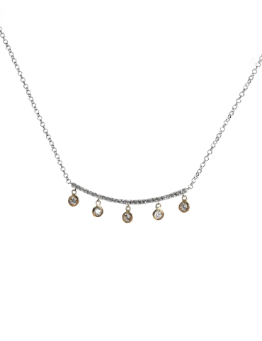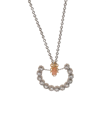 Colar em prata composto por uma malha de cordão, sustentando uma madrepérola natural esculpida em forma de tartaruga com braçadas cravadas com zircónias brancas, olhos e concha de Santiago em ouro amarelo no topo da cabeça