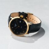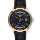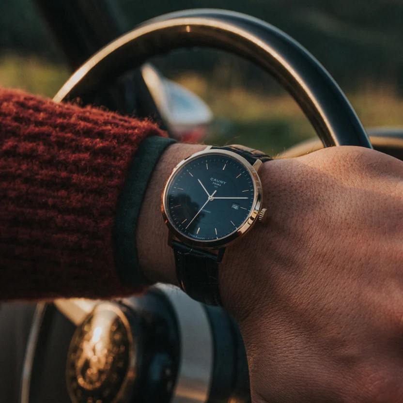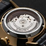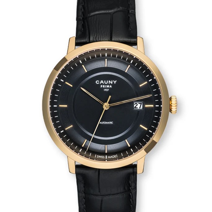 O Cauny Prima é um relógio clássico e muito reconhecido, com movimento automático de alta qualidade produzido em La Chaux-de-Fonds. Destaca-se pelo design elegante, com bracelete preta em pele tipo crocodilo, mostrador preto com detalhes dourados e caixa em aço dourado, resultando numa peça sofisticada para apreciadores de relojoaria.