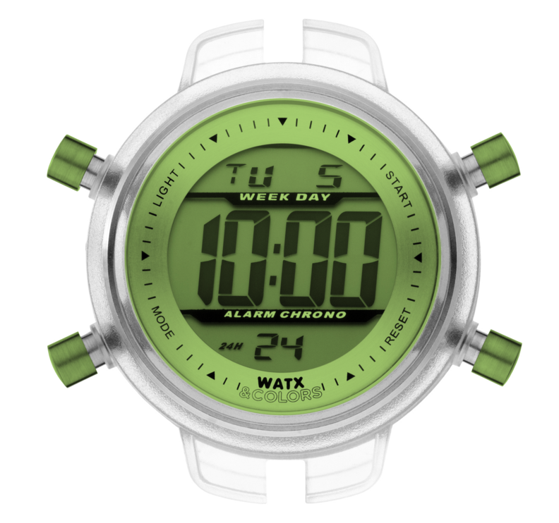 Máquina WATX and CO digital em resina transparente com botões verdes