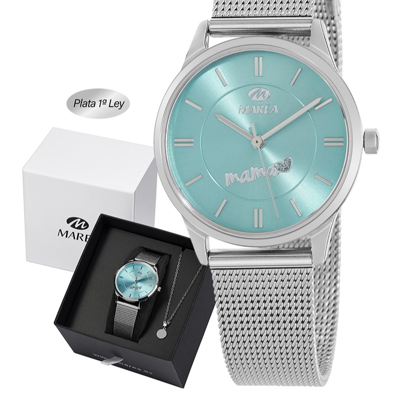 Relógio Marea Mamã com Colar B54210/11. Relógio com caixa em aço e bracelete ajustável em aço. Fundo azul claro e com detalhes em prateado. Colar com pequeno pendente, decorado com uma zircónia.
