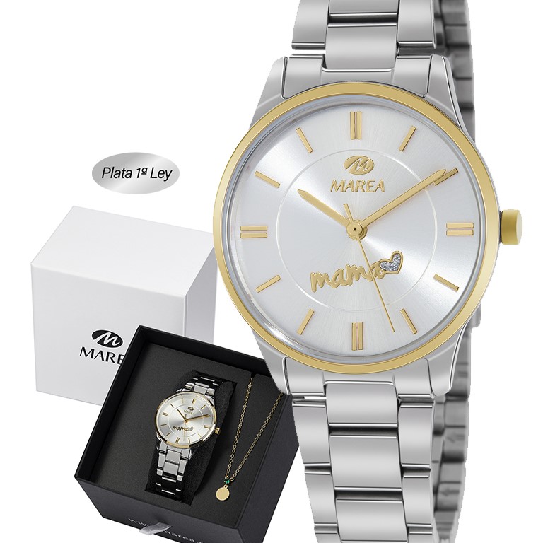 Relógio Marea Mamã com Colar B54211/13. Relógio com caixa em aço e bracelete ajustável em aço. Fundo claro e com detalhes em dourado. Colar com pequeno pendente, decorado com uma zircónia.